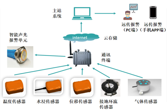 電纜井綜合環(huán)境監(jiān)測系統(tǒng)主要通過通過2.4G無線自組網(wǎng)通信集成傳感器采集實(shí)時數(shù)據(jù),利用NB-ioT物聯(lián)網(wǎng)通信以15-240分鐘一次(可設(shè)置)的頻率向云端發(fā)送數(shù)據(jù),后臺主站再對云端數(shù)據(jù)進(jìn)行整理挖掘并解析及顯示,在有報警觸發(fā)的情況下主站以語音、短信、聲光報警方式進(jìn)行實(shí)時報警。