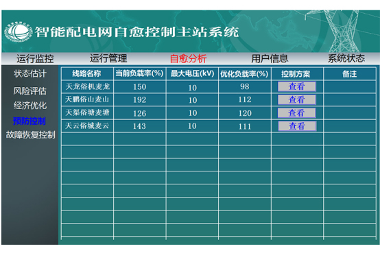 智能配電網(wǎng)自愈控制主站軟件通過智能終端設(shè)備或現(xiàn)有配電自動化系統(tǒng)對配電設(shè)備和分布式電源運(yùn)行狀態(tài)的實(shí)時采集、與現(xiàn)有調(diào)度自動化系統(tǒng)的信息交互實(shí)現(xiàn)整個智能配電網(wǎng)的可感知,對配電網(wǎng)異常運(yùn)行情況如線路負(fù)荷越限、母線電壓越限、變電站出口開關(guān)跳閘或保護(hù)動作給以判斷和報警,即實(shí)現(xiàn)智能配電網(wǎng)“自我感知”